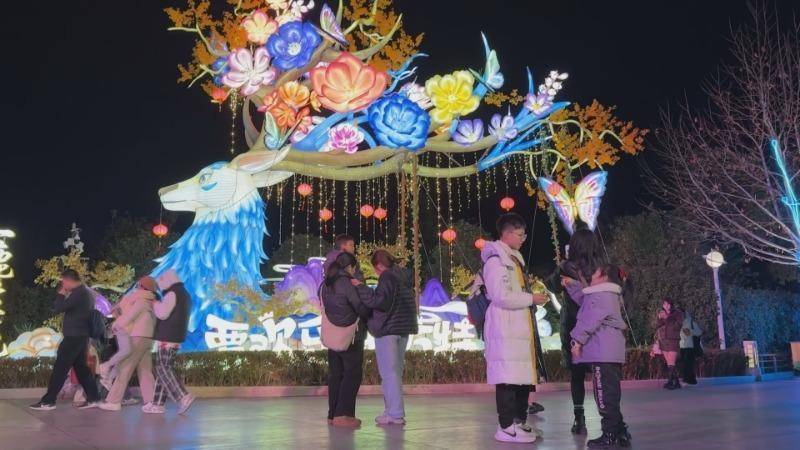 夜幕降临,华灯初上,璀璨花灯将园区装点得流光溢彩。“熊熊舞狮”主灯组喜庆灵动,“一鹿生花”灯组则以祥瑞灵鹿为主体,灯影流转间,繁花次第“绽放”,浪漫诗意与吉祥寓意相得益彰;信步往前,“马力全开”灯组紧扣马年新春主题,以骏马为原型,搭配趣味流行语,展现了传统与现代碰撞的独特韵味。各类主题花灯组错落排布、相映成趣,吸引了不少游客驻足观赏、拍照打卡。